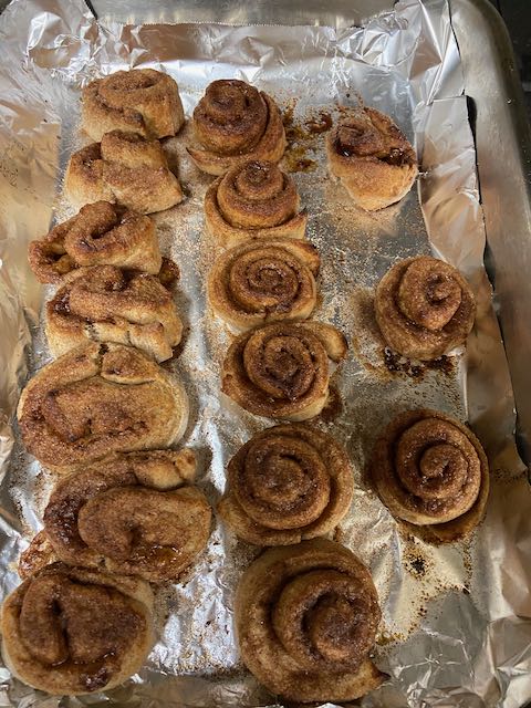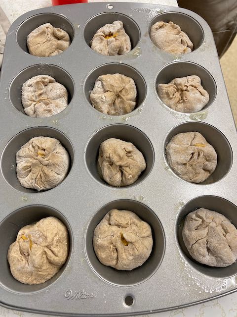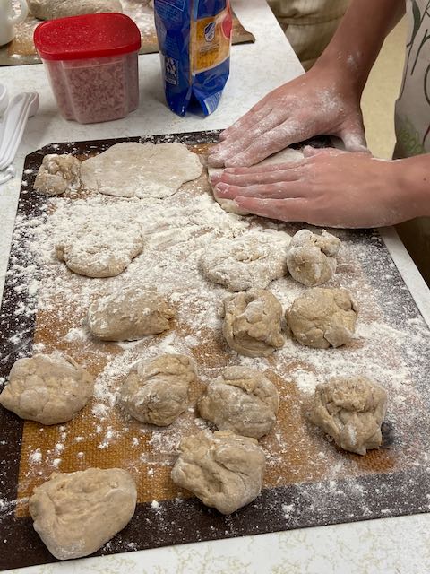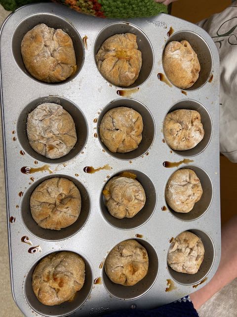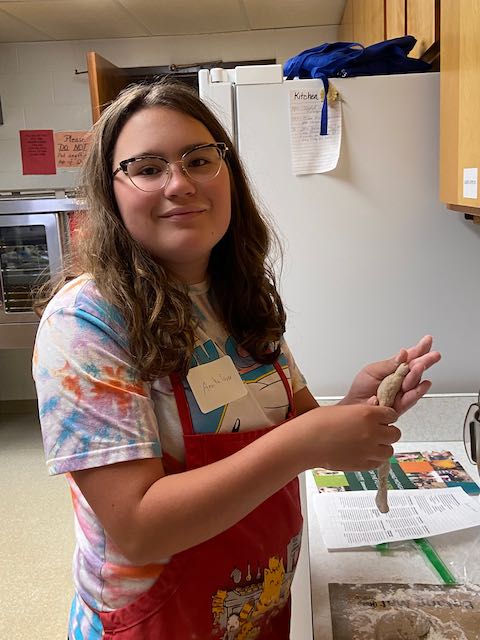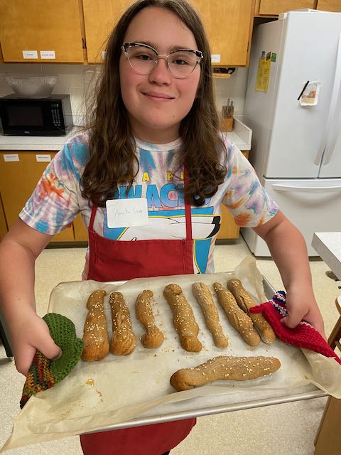 After learning the basics of quick breads with Karlyn the following week the students prepared a yeast dough.  They were then split into 3 teams of 2 to prepare 3 different recipes out of the dough they prepared the week before.  Sesame Breadsticks, Cinnamon Rolls and Ham and Cheese purses were prepared by the kids.